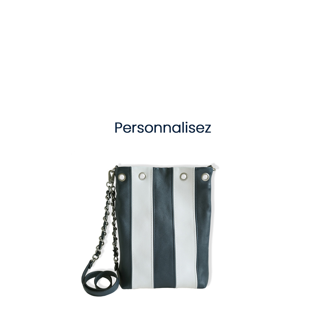 1 face rayures : assemblage veau grainé coloris meringue et cuir d’agneau coloris myrtille
