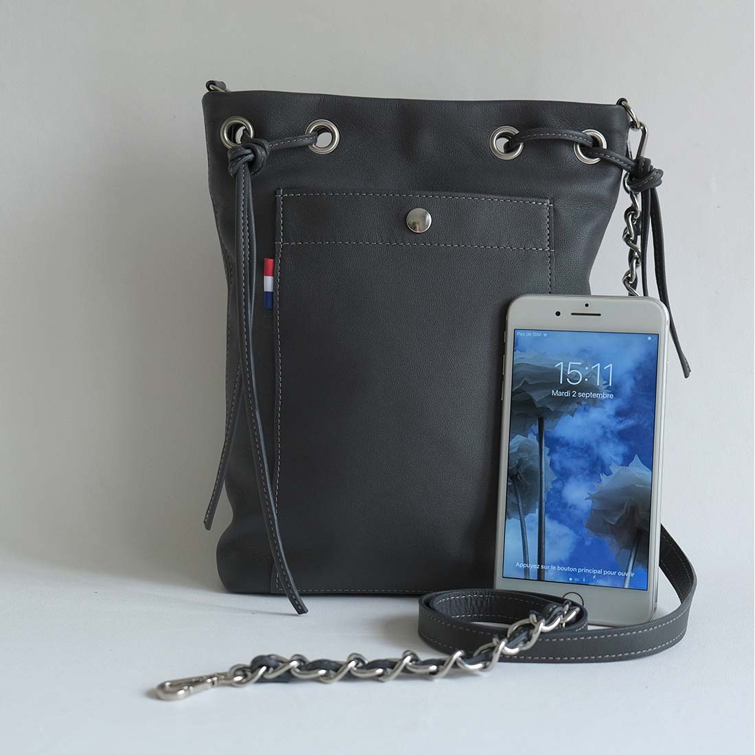 1 face uni cuir d’agneau coloris gris lentille équipée d’une poche pour smartphone tout format (non fourni) avec fermeture par bouton pression.