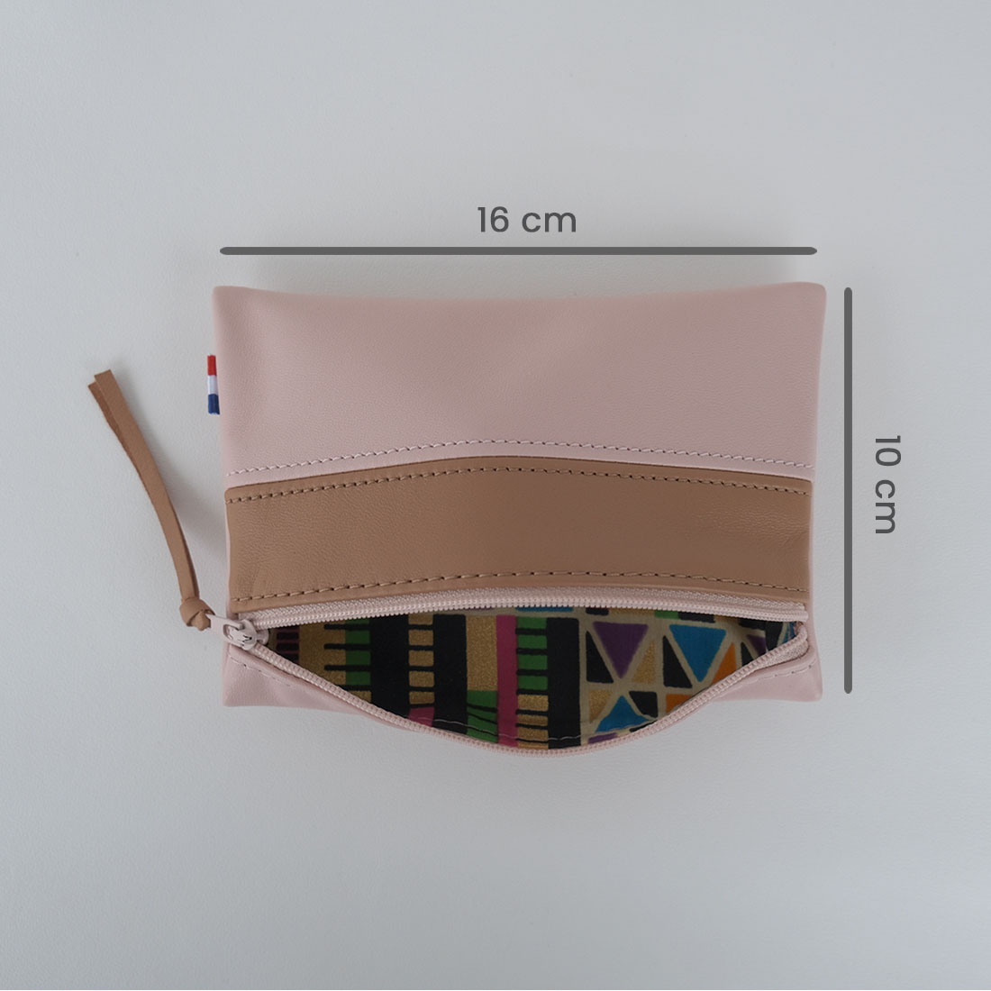 Pochette zippée rectangulaire format midi bicolore guimauve caramel en cuir d’agneau doublée Wax coton.